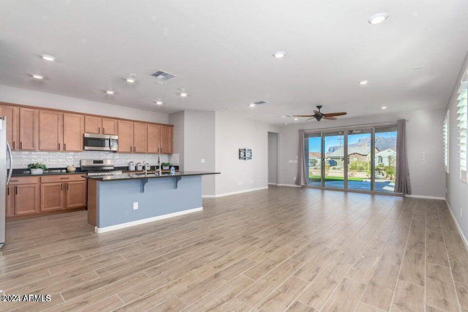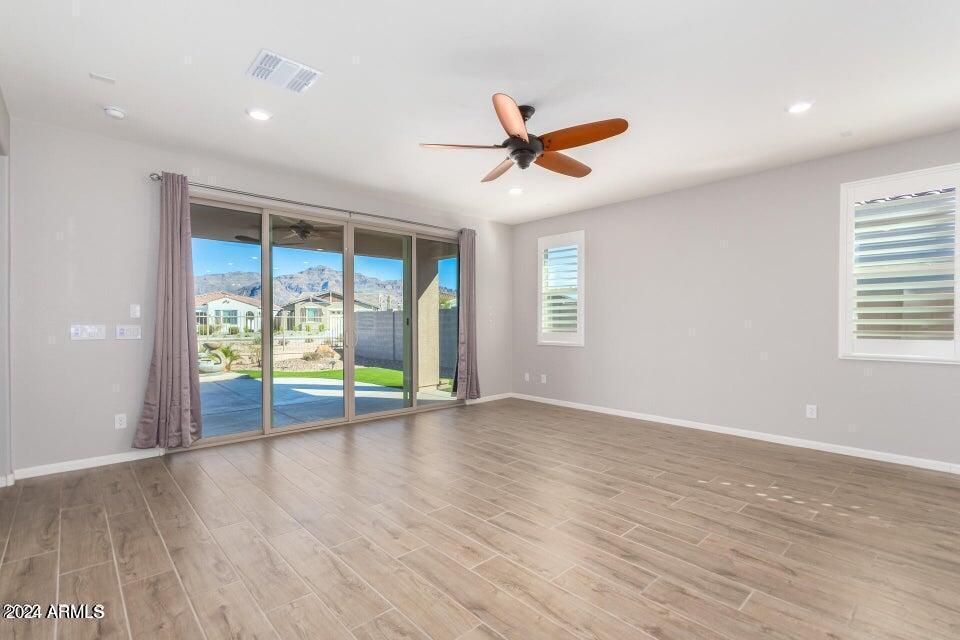 Beautiful four bedroom home with wood tile plank flooring. Gourmet kitchen with stainless steel appliances and granite countertops and tile backsplash. Each room has ceiling fans. The windows have plantation shutters. There is a water softener and washer and dryer. Home is immaculate and has a stunning view of the Superstition mountains. Backyard has a great patio with pavers with artificial turf and is fully landscaped with water fountain. It is located in Peralta trail conveniently off the 60 freeway and walking distance to many trail heads. It is a beautiful community and a lovely place to call home