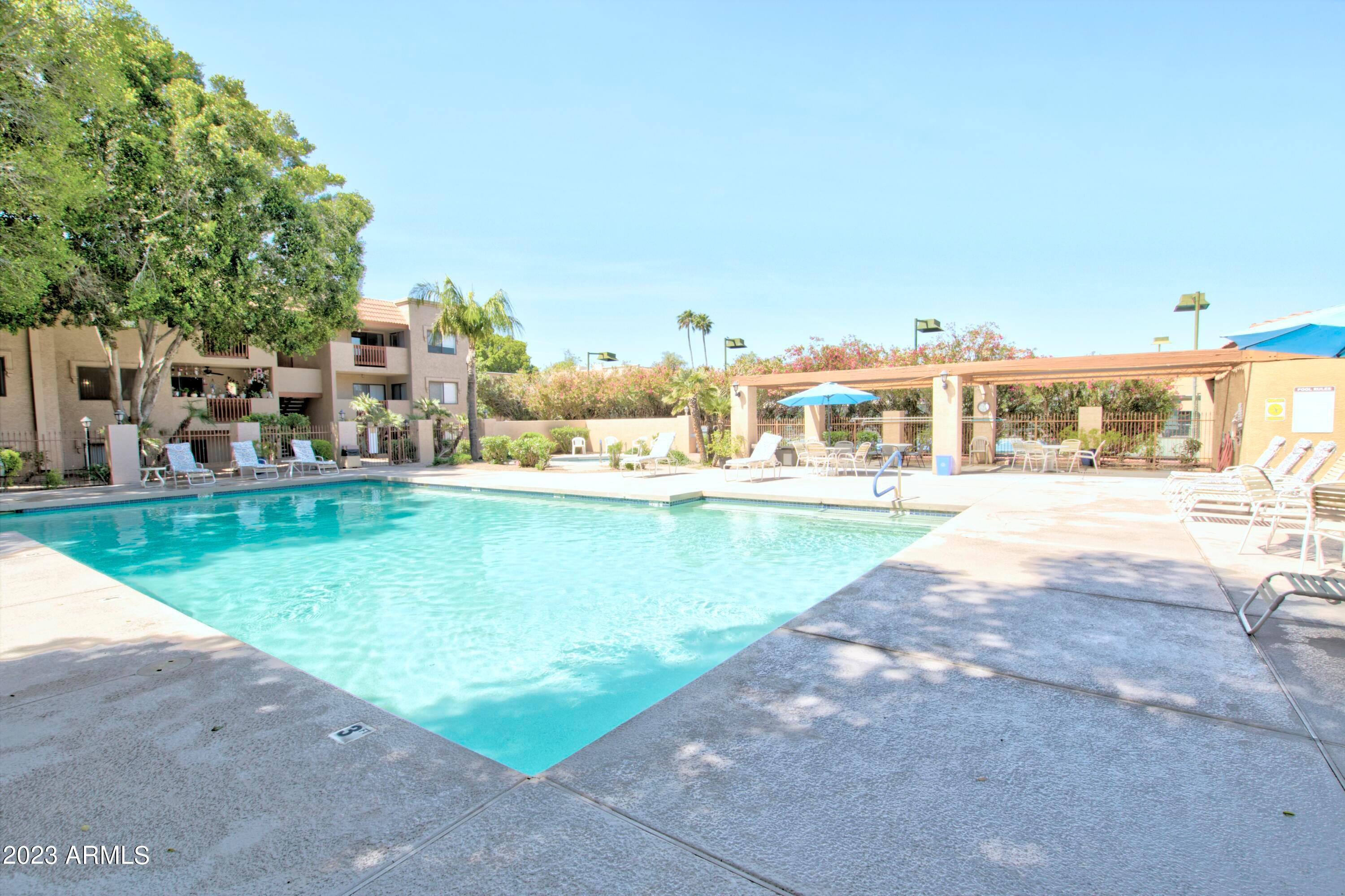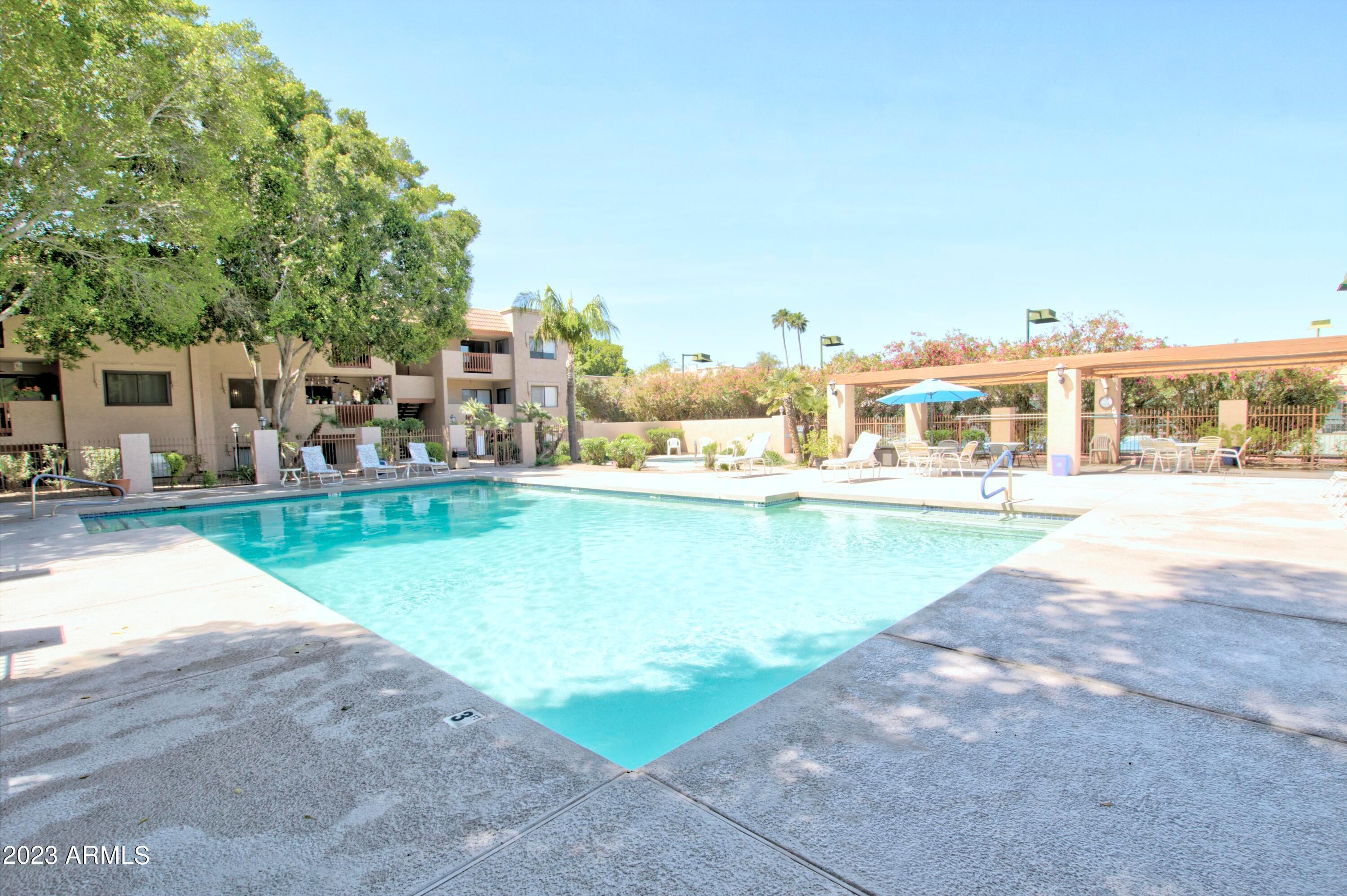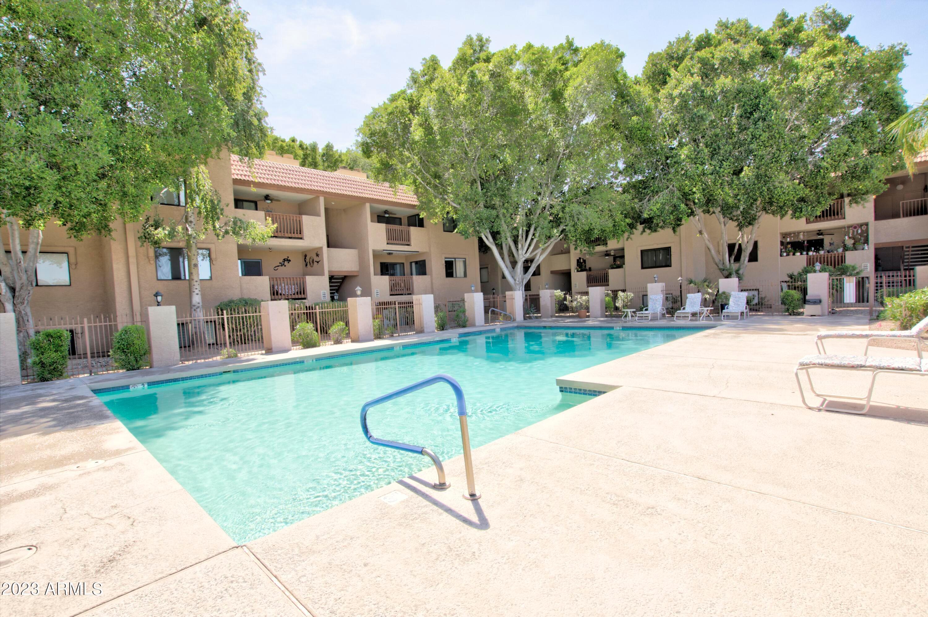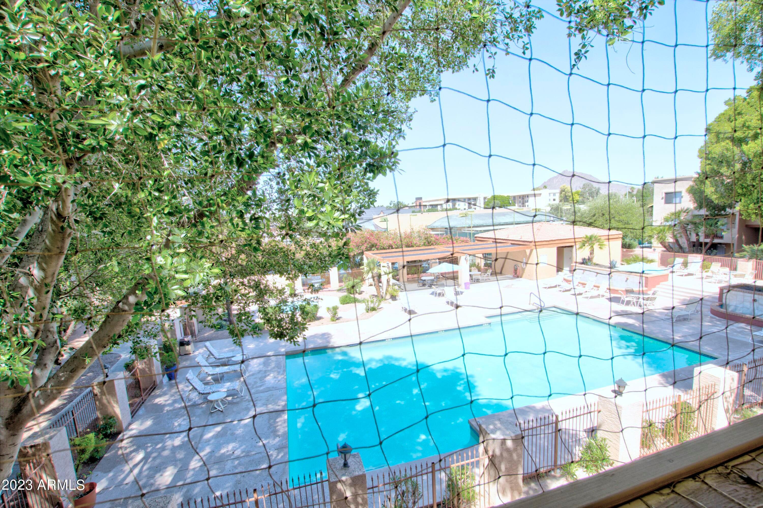 Beautiful move in ready and fully furnished condo in a prime location with view of community pool, Center Court, and views of Camelback Mountain. You’ll be thrilled by the charming interior with a neutral paint, laminate flooring in high-traffic areas, a cozy fireplace, and a living room with sliding door access to the balcony. Beautiful dining room, galley kitchen with upgraded countertops and plenty of space, and a breakfast bar. Relax after a hard day’s work in the primary bedroom with a large closet and a private bathroom with dual sinks. Grab your favorite drink and relax on the balcony. Perfect location walking distance from Old Town Scottsdale. Gain access to community amenities such as a heated pool, tennis courts, clubhouse and more! This rare gem will go fast