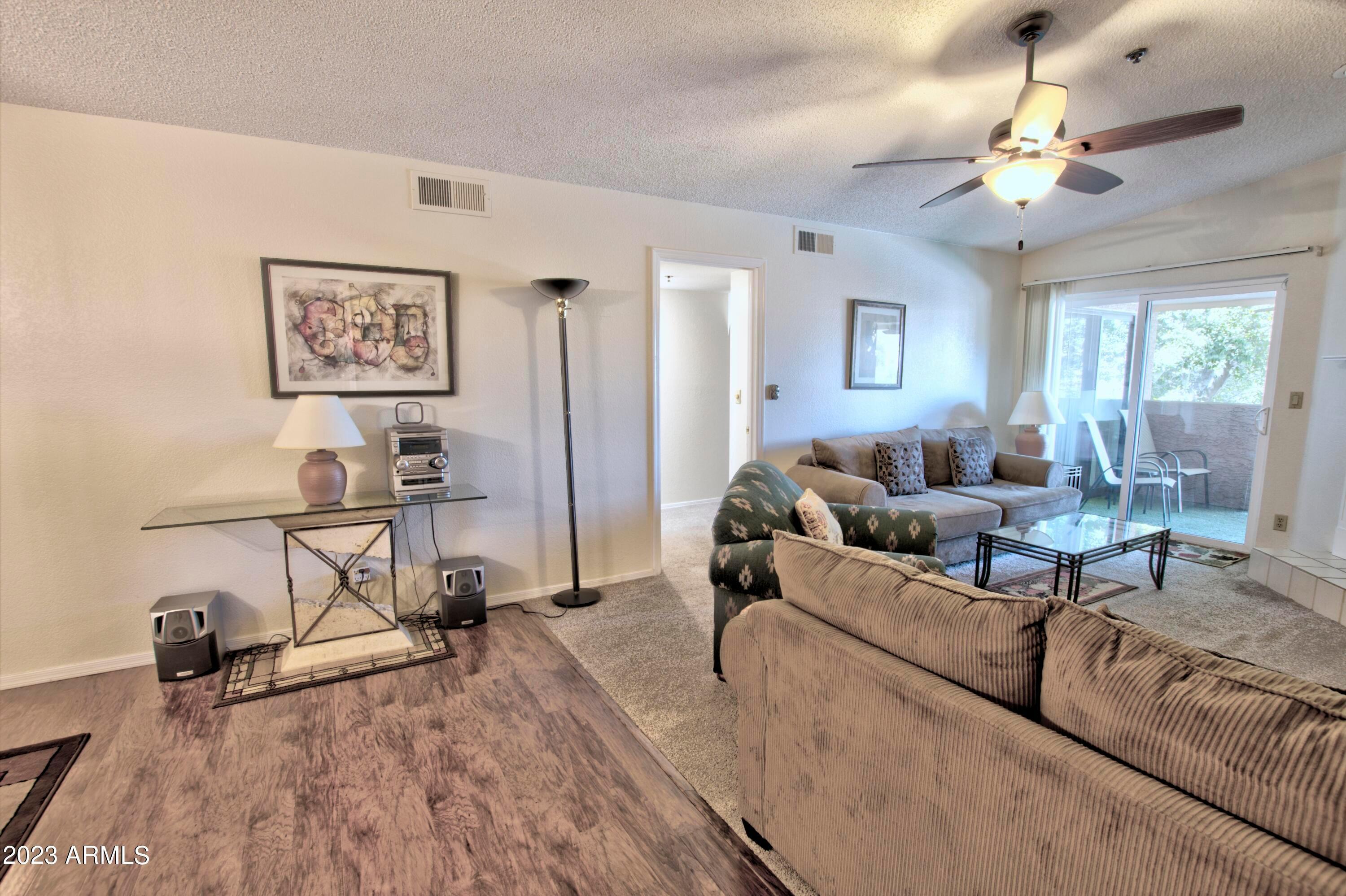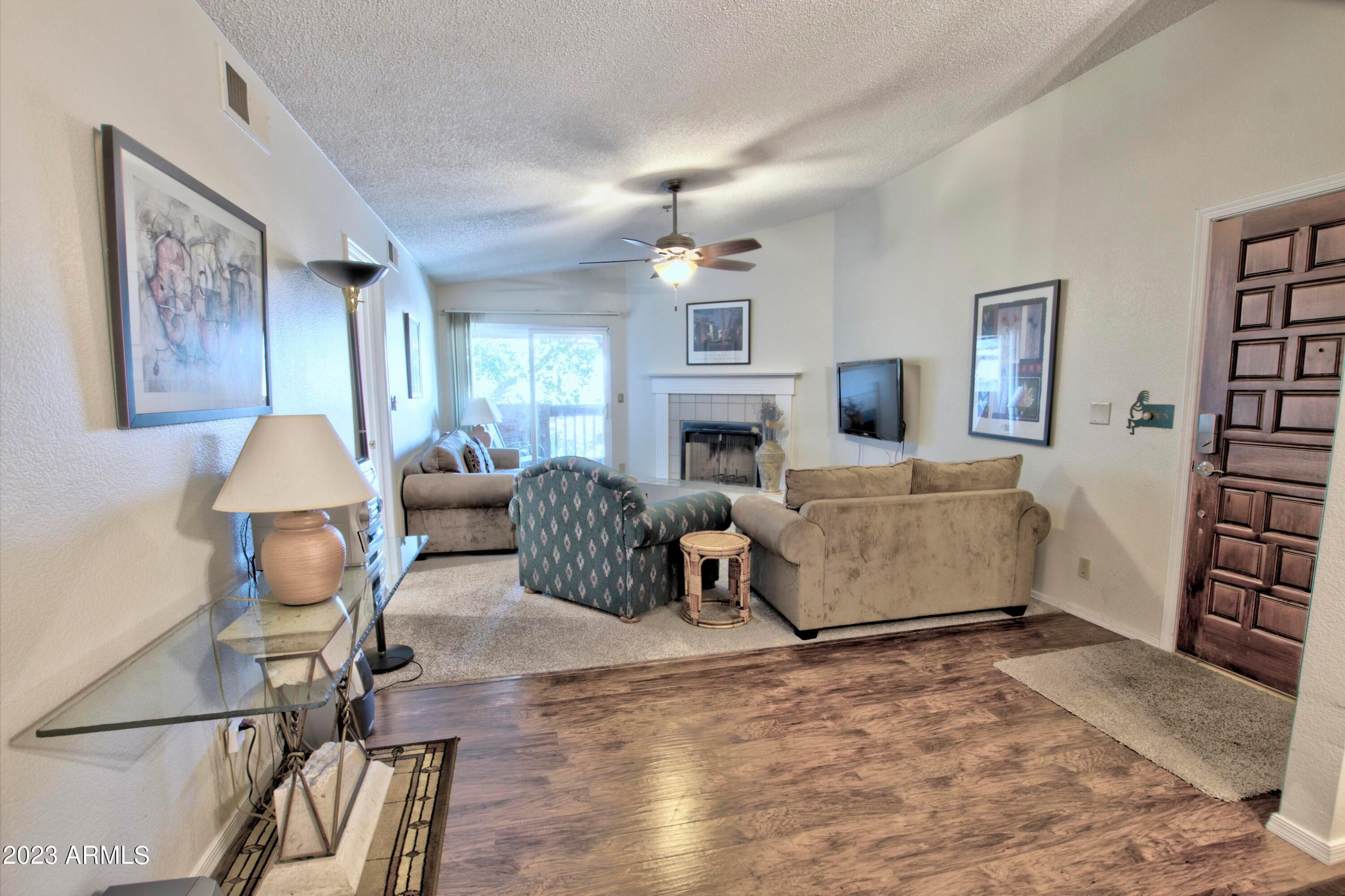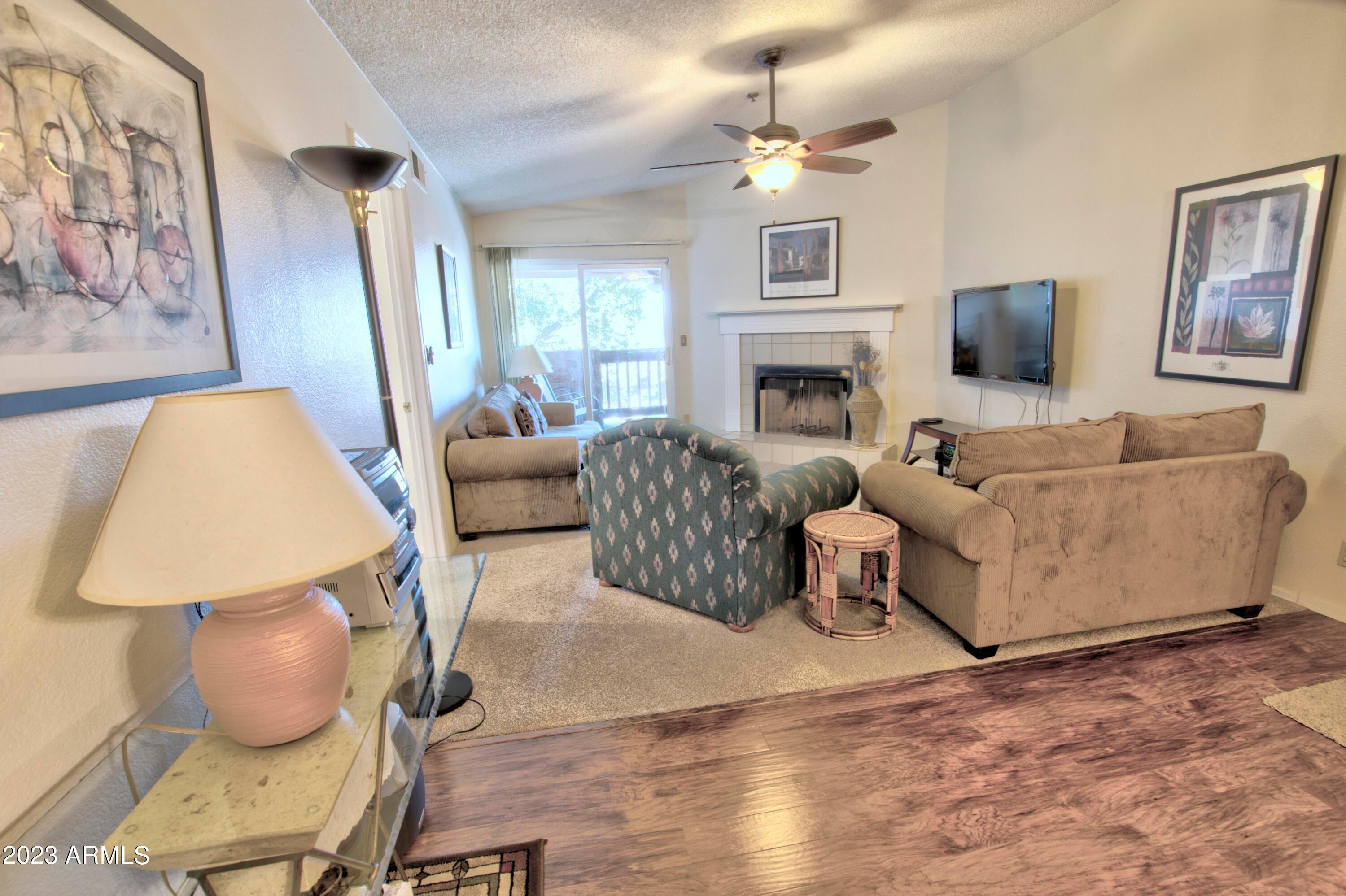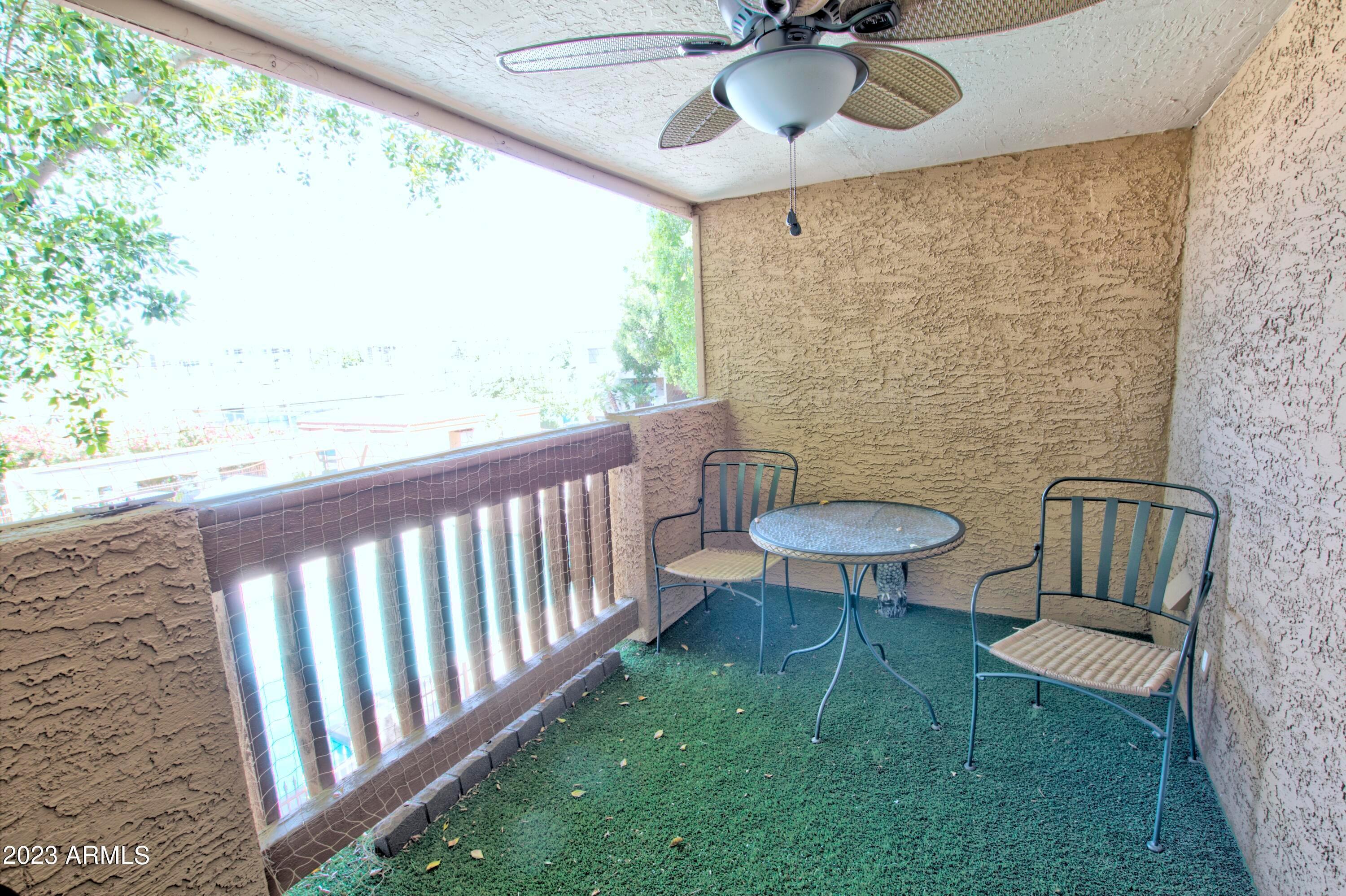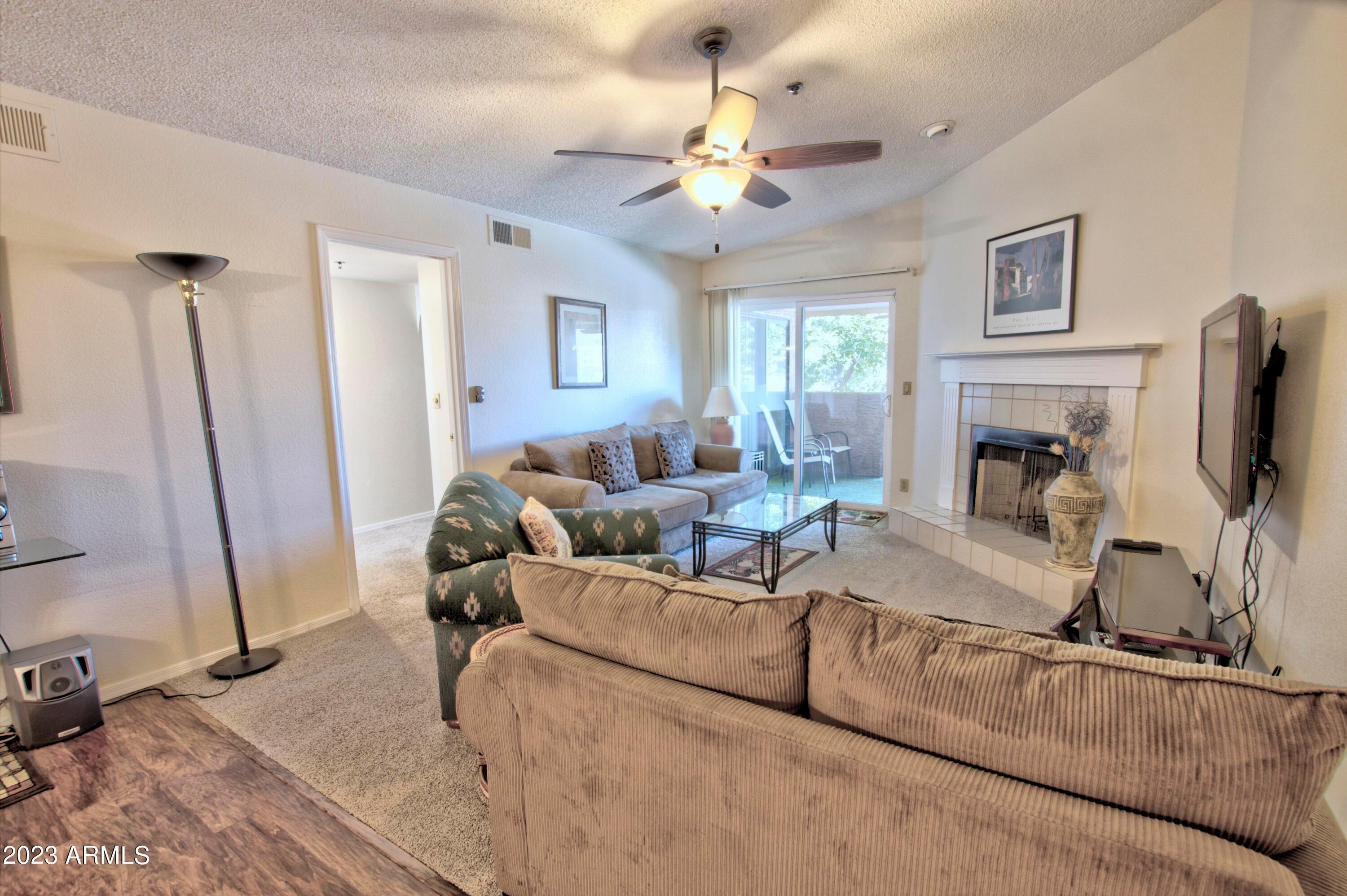 Beautiful move in ready and fully furnished condo in a prime location with view of community pool, Center Court, and views of Camelback Mountain. You’ll be thrilled by the charming interior with a neutral paint, laminate flooring in high-traffic areas, a cozy fireplace, and a living room with sliding door access to the balcony. Beautiful dining room, galley kitchen with upgraded countertops and plenty of space, and a breakfast bar. Relax after a hard day’s work in the primary bedroom with a large closet and a private bathroom with dual sinks. Grab your favorite drink and relax on the balcony. Perfect location walking distance from Old Town Scottsdale. Gain access to community amenities such as a heated pool, tennis courts, clubhouse and more! This rare gem will go fast