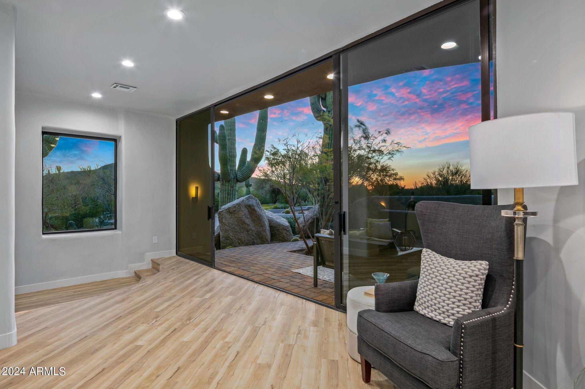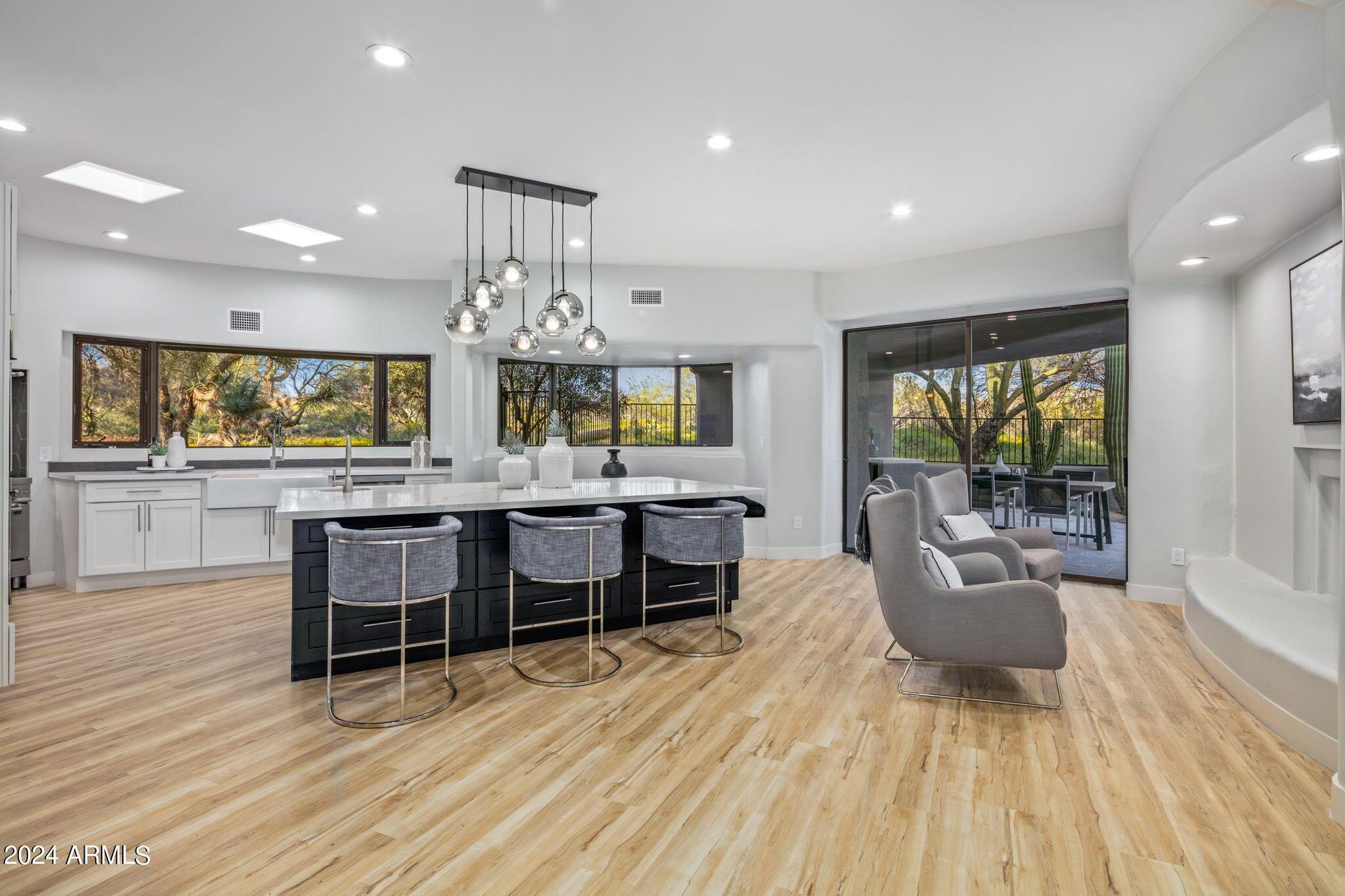 This Sincuados stunner features a complete transformation, both inside and out. Nestled in a serene spot away from the street, offering privacy along with a welcoming circular paver driveway and surrounded by extraordinary desert scenery. Step inside to discover an open floor plan flooded with natural light, featuring a spacious kitchen island, convenient walk-in pantry, and a large farmhouse sink with views of the beautiful desert landscape. The high ceilings and airy layout make it an ideal space for entertaining guests. With a thoughtful split floor plan, this home boasts four bedrooms, each with its own ensuite bathroom, ensuring comfort for everyone. The primary bedroom highlights an attached office, perfect for those who work from home or need a quiet retreat.